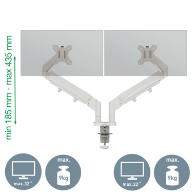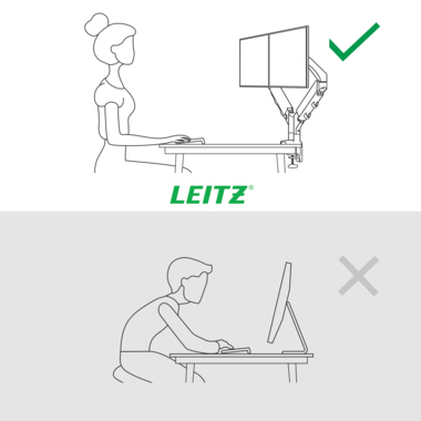 Der Leitz Ergo platzsparende Dual-Monitorarm wirkt sich positiv auf die Körperhaltung aus, fördert die richtige Ausrichtung der Augen und unterstützt den Nacken- und Schulterkomfort, wenn die Höhe der Monitore korrekt und wie empfohlen auf die ideale ergonomische Position eingestellt wird. Der Monitorständer bleibt in allen Höhen und Winkeln stabil und lässt sich leicht zwischen Quer- und Hochformat wechseln. Das Design ist ideal, wenn nur wenig Platz zur Verfügung steht. Dank seiner extrem vielseitigen Arme, die sich mühelos flach zusammenklappen, neigen und mit nur einer Hand in alle Richtungen manövrieren lassen, wird wertvoller Platz auf dem Schreibtisch frei. Ergonomisch gestaltet, um das Wohlbefinden zu fördern und die Produktivität zu steigern. Einfache Montage durch die mitgelieferte abnehmbare Vesa-Platte und die silikonbeschichtete C-Klemme, die Vibrationen reduziert und die Tischoberfläche schütz, oder durch die Tüllenöffnung. Das integrierte Kabelmanagementsystem organisiert die Monitorkabel und sorgt somit für einen aufgeräumten Arbeitsbereich.